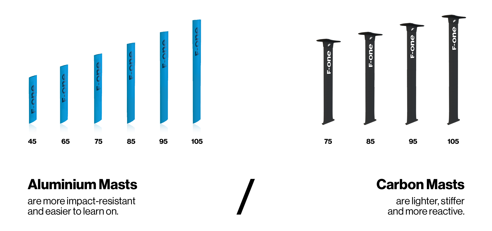 Der F-ONE Aluminiummast kann für alle Disziplinen, Kite, Surf, Stand Up Paddle, Wing Foil und Windsurf verwendet werden. Das Profil wird mit Präzision aus einem 6063 Aluminiumblock extrudiert. Die Form seines Profils profitiert von unserer jahrelangen Erfahrung im Kitefoilen, um das beste Gleitgefühl zu bieten, während die Festigkeit hoch und das Gewicht niedrig gehalten wird. Er wird mit zwei Edelstahl-Helicoil-Einsätzen unten und oben zur Befestigung der Verbindungsteile geliefert und ist somit voll modular. Der Aluminiummast kann auf jedem Foil der Serie verwendet werden und es ist sehr einfach, von einer Länge zur anderen zu springen (45 / 55 / 65 / 75 / 85 / 95 cm).